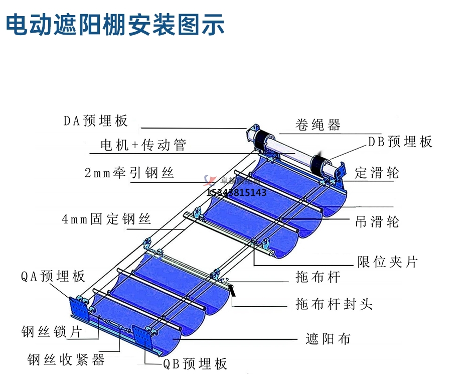 幼兒園FCS折疊遮陽天棚即使用管狀電機,利用鋼絲循環(huán)運動,從而帶動面料收放,達到遮陽的效果。FCS折疊遮陽天棚機構(gòu)分為傳動和面料兩大部分:上方傳動部分的另一端為動力端,利用管狀電機旋轉(zhuǎn)帶動卷管及固定在卷管上的卷繩器旋轉(zhuǎn)從而是一根鋼絲繩進行收放。傳動部分的另一端為滑輪鋼絲通過滑輪進行換向,使一根鋼絲的兩端能同時固定卷繩器上,并且鋼絲始終保持繃緊。面料部分的上半部分是一根兩端固定并繃緊的鋼絲(天棚簾跨度過大的改用滑動門軌),下半部分為面料,面料從頂端開始安裝牽引桿,間距等分(通常為0.8米左右)。牽引桿上安裝流動滑輪,滑輪在固定在鋼絲上運行。第一根牽引桿與傳動鋼絲連接,在電機固定鋼絲展開與收攏。