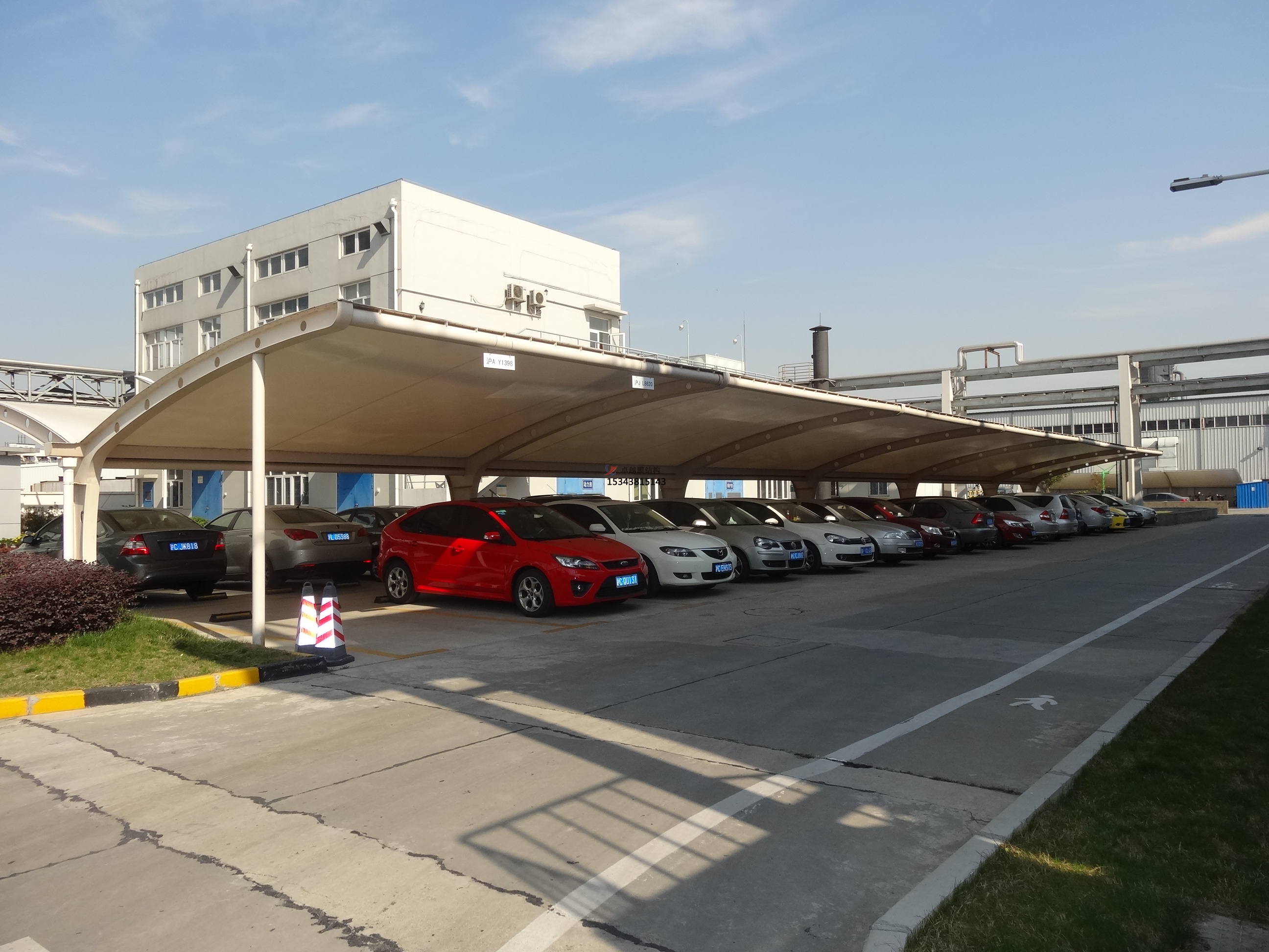 3,雨棚內(nèi)部選用Φ38鍍鋅圓管與雨棚結(jié)構(gòu)焊接,加蓋膜結(jié)構(gòu)污水池增強(qiáng)棚頂部強(qiáng)度,可讓棚內(nèi)感覺寬闊通亮,??寇囕v輕松方便,完全吻合雨棚制造要求標(biāo)準(zhǔn);
