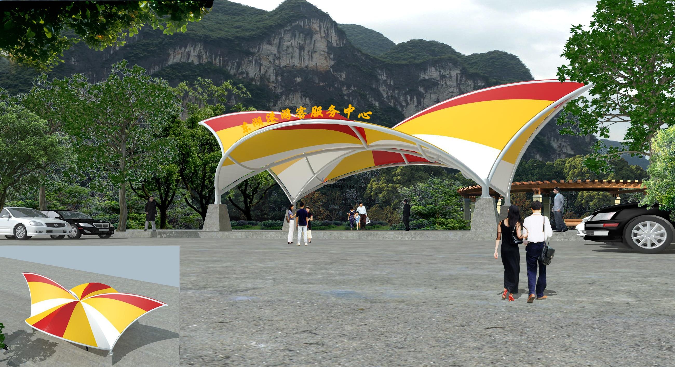 景觀膜結構遮陽棚的一個重要作用就是具有非常強的抗壓功能,抵抗各種天色變化,如日曬、雨淋、風雪、臺風等對其壓力的影響,保持建筑物的結構的韌性、結構的穩(wěn)定性。選定景觀膜結構遮陽棚的膜面的形態(tài)和材料時要考慮到所有可能的天色狀況,并盡可能利用建筑本身等被動方法來減少帶來的風險。為了招架風雪,膜面的外形應使排水通暢使捷,避免在其上形成水兜或雪的堆積。