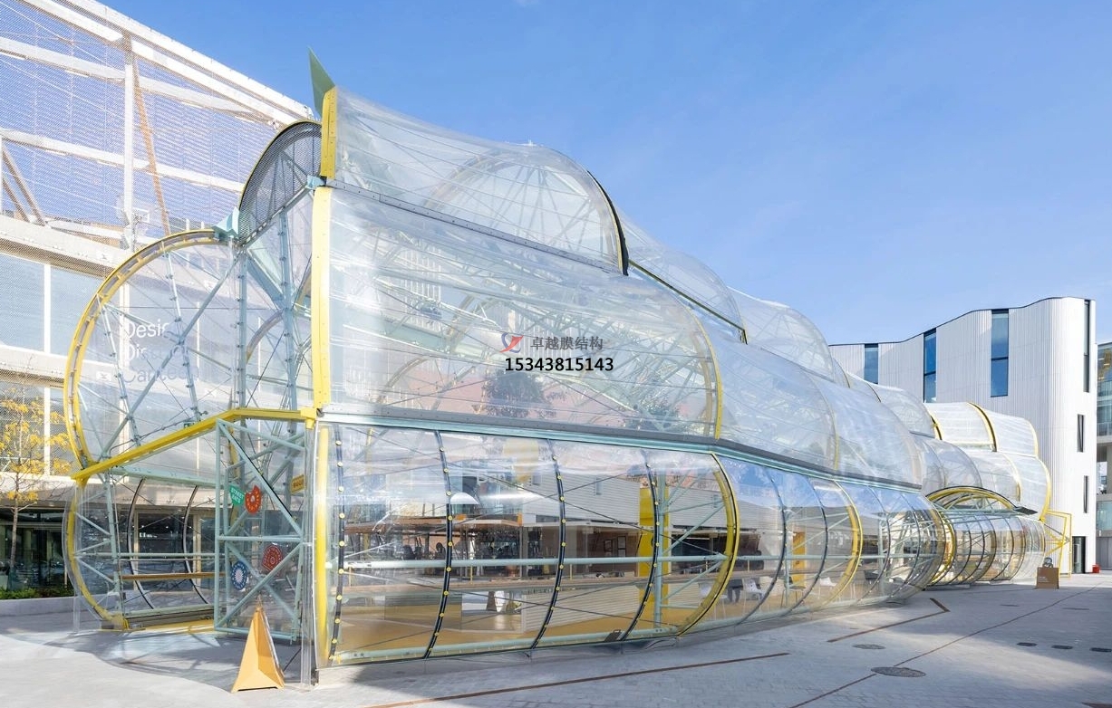 ETFE是一種新興的建筑材料,由乙烯和四氟乙烯共聚而成,是一種輕質(zhì)、耐熱的薄膜,俗稱“軟玻璃”,也是目前為止最強韌的氟塑料。ETFE在保持了PTFE良好的耐熱、耐化學(xué)和電絕緣性能的同時,它的耐輻射、機械性能和加工性能有了很大程度的改善。