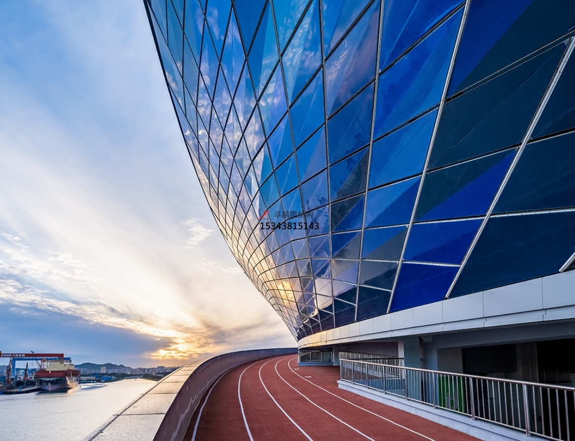 梭魚灣足球場設(shè)計靈感來源于“海浪與海螺”,設(shè)計理念為“炫彩疊浪”,建筑立面定妝色“海洋藍”,頂棚呈白色,“藍海白云”與飾面象征波光粼粼的水之形態(tài),將大連的海洋文化、足球精神融于一體。