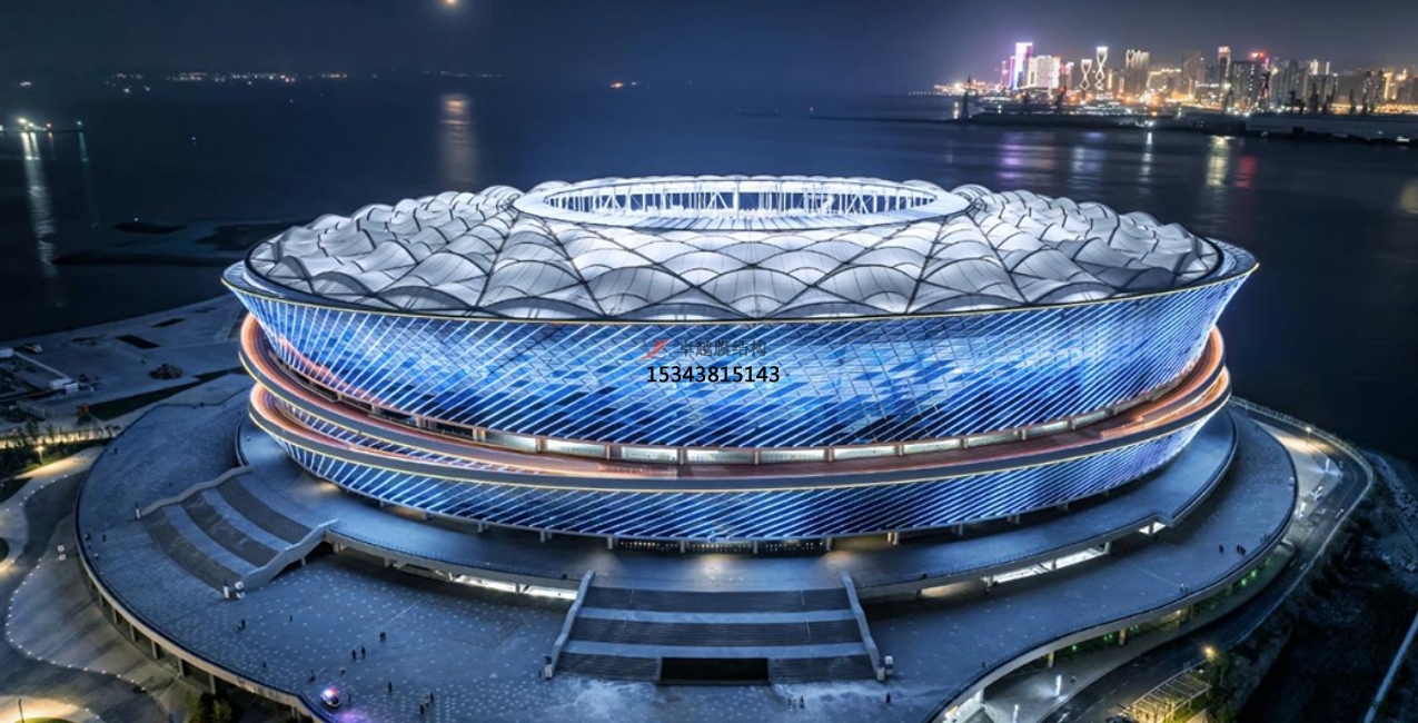 2022年,大連梭魚灣體育中心,立面使用德國NOWOFOL ETFE 9種不同藍色彩膜,頂面內(nèi)圈使用透明