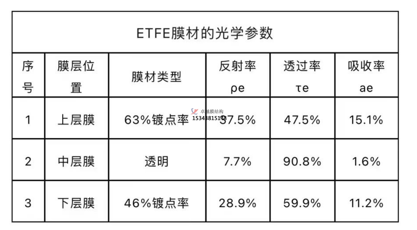 多層結(jié)構(gòu)設(shè)計:設(shè)計多層 ETFE 膜結(jié)構(gòu)可以進(jìn)一步提高其隔熱光學(xué)性能。例如,將隔熱膜設(shè)計為 3 層氣枕模型,其可見光透過率為 41.04%,太陽光透射比為 23.23%,紅外阻隔率為 99.58%,滿足綠建三星光學(xué)要求此外,研究還提出了一種由 ETFE 膜和 Low-E 涂層組成的動態(tài)熱絕緣系統(tǒng),該系統(tǒng)由一系列空氣腔組成,空氣腔之間由 ETFE 膜分隔,Low-E 涂層能夠減少輻射熱傳遞,該系統(tǒng)具有靈活適應(yīng)未來氣候變化的潛力。