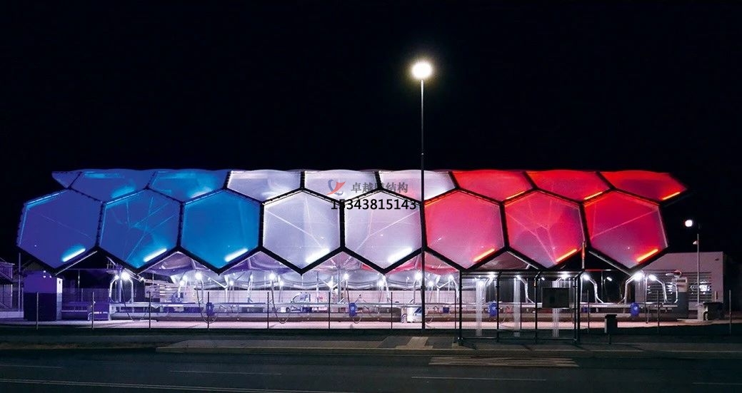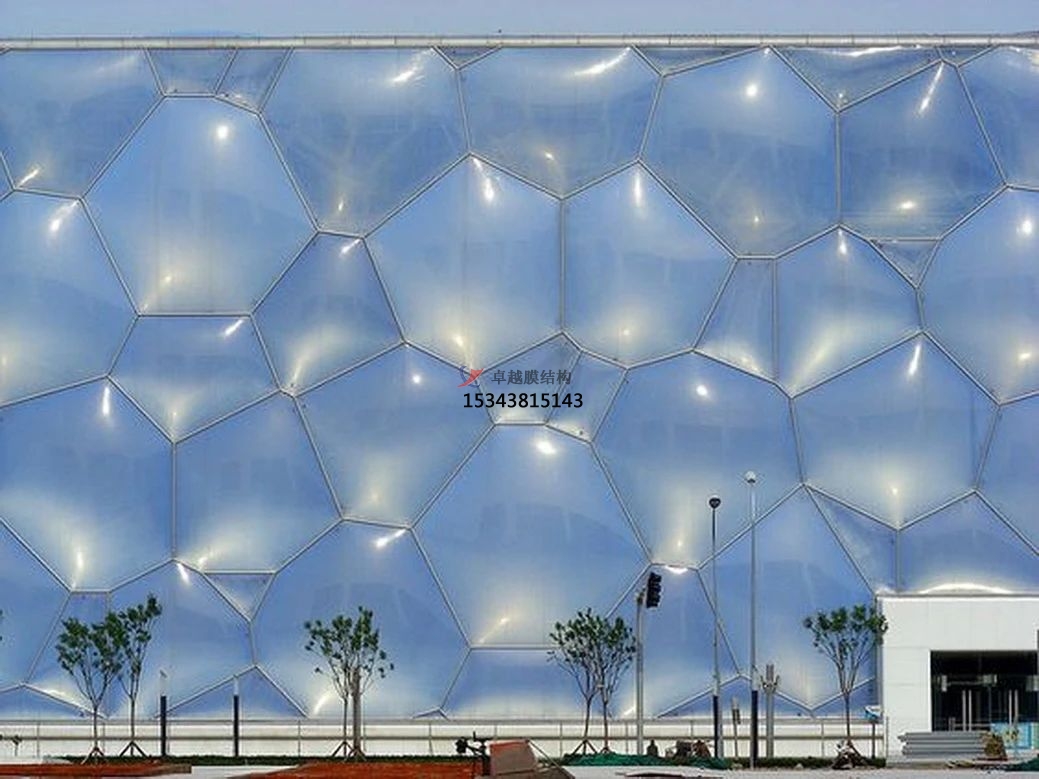 張拉膜結(jié)構(gòu)可以根據(jù)需要制成任意復(fù)雜曲面形狀,體現(xiàn)自然流暢之美;并有多種顏色的膜材可選,以適應(yīng)周邊的環(huán)境、滿足建筑效果要求;而且膜結(jié)構(gòu)質(zhì)量輕,一般不需要太龐大的支撐結(jié)構(gòu),這是其他建筑材料無法比擬的優(yōu)勢所在。