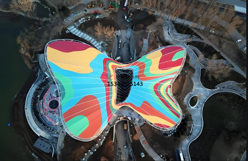 ETFE膜材除了常規(guī)的透明、藍(lán)色、白色、銀色鍍點(diǎn)外,其實(shí)還有五顏六色的彩色系列。今天就給大家介紹一個(gè)ETFE彩色膜應(yīng)用的經(jīng)典案例2019年北京世園會的主場館——媯汭劇場,外觀為彩色蝴蝶造型。