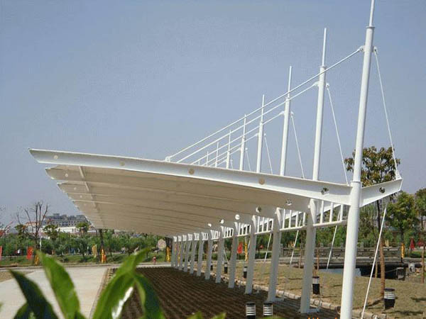 膜結構停車棚主體外觀為中間拱起一個帽子形式的頂,從中間帽頂拉出拉索到立柱固定.連帽頂膜結構車棚是很多帽頂相連,組合成一個大型的車棚.