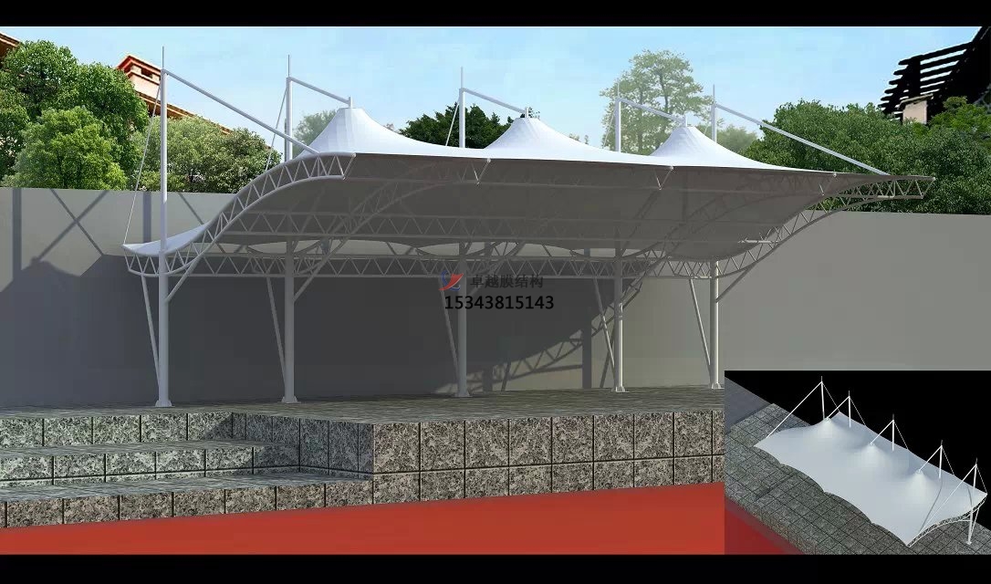 膜結(jié)構(gòu)景觀棚頂部和底部采用了進(jìn)口膜材,非常的堅(jiān)固,是亞力克板材的200倍,普通玻璃的50倍。防暴雨、暴曬、一般情況下使用壽命在10-15年