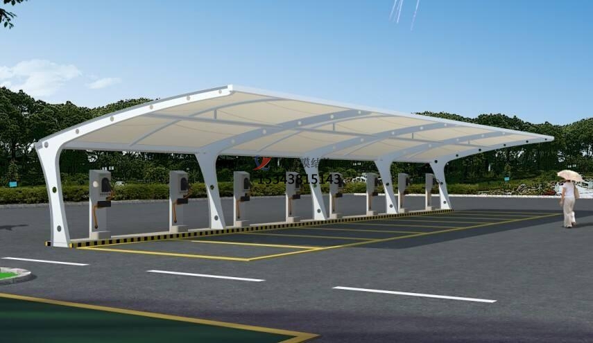 3.商業(yè)廣場(chǎng)雨棚搭建頂部的密封板加蓋有棕褐色(顏色可選擇)日光板,與棚整體框架用分層鉚接固定,耐酸堿腐蝕,有足夠的強(qiáng)度維持棚內(nèi)車輛。