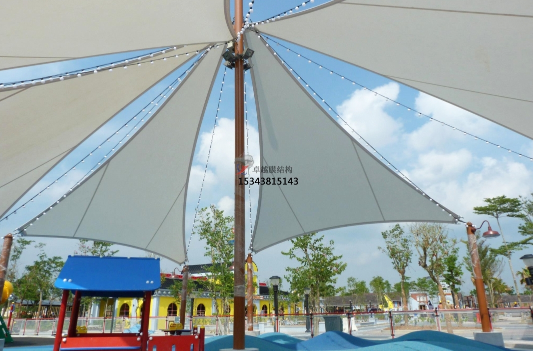 3、多功能性:除了遮陽(yáng)功能外,膜結(jié)構(gòu)遮陽(yáng)棚還可以作為陽(yáng)雨棚、涼亭、連廊等使用。其構(gòu)思獨(dú)特、因地制宜的設(shè)計(jì),使得遮陽(yáng)棚在賦予景觀小品藝術(shù)化的同時(shí),也將功能實(shí)用性融入其中,提升了游樂(lè)場(chǎng)的整體品質(zhì)。