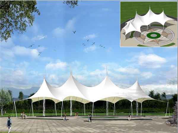 2、景觀膜結(jié)構(gòu)是目前發(fā)展很快的一種新型空間結(jié)構(gòu),是一種效率極高的張力集成體系,可以充分發(fā)揮鋼索的強(qiáng)度與張拉整體結(jié)構(gòu)的空間作用。它通過鋼骨架、鋼索與膜材共同受力形式穩(wěn)定曲面來覆蓋建筑空間,具有高度的形體可塑性和結(jié)構(gòu)靈活性,即通過對膜材內(nèi)部施加一定的預(yù)張力,使其具備了抵抗外荷載能力,從而充當(dāng)結(jié)構(gòu)材料的一種結(jié)構(gòu)體系。我公司先后在金華地區(qū)承接了金華永盛廣場景觀、金華中心廣場景觀、金華建筑藝術(shù)公園景觀小品的設(shè)計施工,簡介如下: