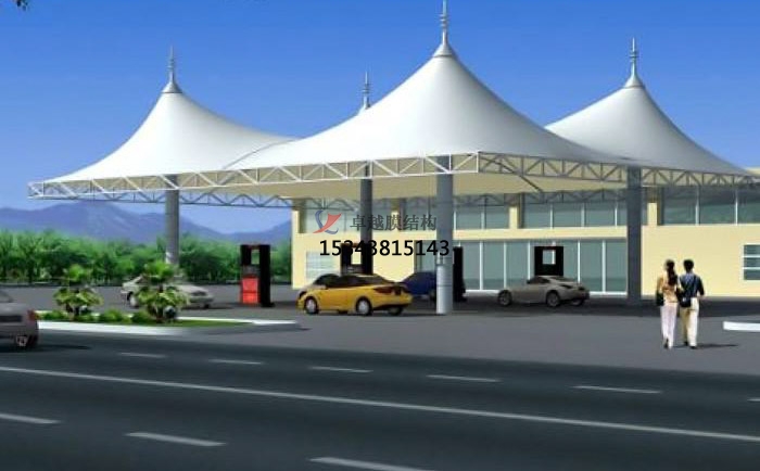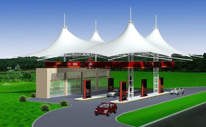 尖頂加油站張拉膜結(jié)構(gòu)效果圖展,常見的加油站張拉膜結(jié)構(gòu)是尖頂?shù)木佣?,白色pvc材質(zhì)的膜也是居多,看上去干凈整潔,而且是阻燃材料,防火,防潮,使用周期久,易于護(hù)理和維護(hù),也是成為眾多加油站的不二之選。
