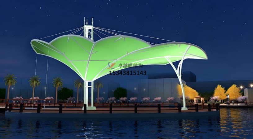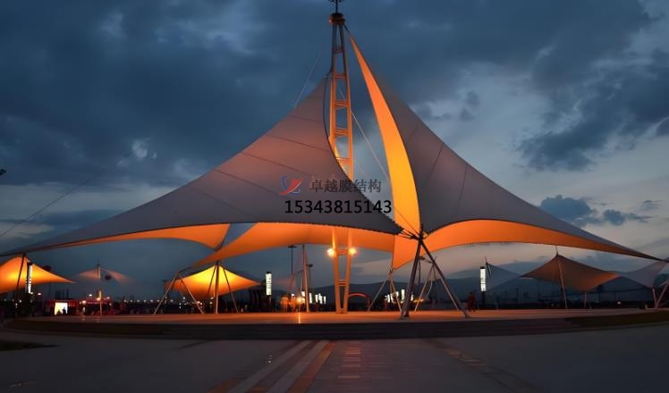 張拉膜景觀的應(yīng)用場(chǎng)景:商業(yè)空間,文化設(shè)施,運(yùn)動(dòng)場(chǎng)地,旅游景點(diǎn)。在商業(yè)空間中,如購物中心、商業(yè)廣場(chǎng)的入口、中庭等,可吸引顧客目光,提升商業(yè)氛圍。在文化設(shè)施中博物館圖書館等文化場(chǎng)所,可營造開放、溫馨的室內(nèi)環(huán)境,增添文化藝術(shù)氣息。在運(yùn)動(dòng)場(chǎng)地中足球場(chǎng)、籃球場(chǎng)等運(yùn)動(dòng)場(chǎng)館的屋頂或看臺(tái),實(shí)現(xiàn)大跨度覆蓋,為觀眾和運(yùn)動(dòng)員提供良好的空間環(huán)境。在旅游景點(diǎn)景區(qū)大門、游客服務(wù)中心、觀景臺(tái)等,可彰顯地域特色,為游客提供遮陽避雨的空間。張拉膜景觀材料可在工廠預(yù)制,現(xiàn)場(chǎng)安裝快速高效,大大縮短施工周期。這種結(jié)構(gòu)通常采用預(yù)應(yīng)力拉索體系,利用邊鎖的拉力和膜材的形狀構(gòu)成造型,盡可能減少結(jié)構(gòu)體型對(duì)膜材視覺的影響常用彩色膜材以體現(xiàn)其千變?nèi)f化的浪漫情懷。其靈活的設(shè)計(jì)和組合方式,使其能夠適應(yīng)各種復(fù)雜的地形和環(huán)境。張拉膜景觀在設(shè)計(jì)中,會(huì)充分結(jié)合當(dāng)?shù)氐臍夂?、景觀和文化背景,使其不僅具有功能性,還能成為地域文化的象征,提升旅游地區(qū)的品質(zhì)形象。此外,張拉膜材料本身具有顯色性,在夜間彩燈的映射下能形成絢麗繽紛的景觀效果,為人們帶來時(shí)尚、輕松的休閑感受。
