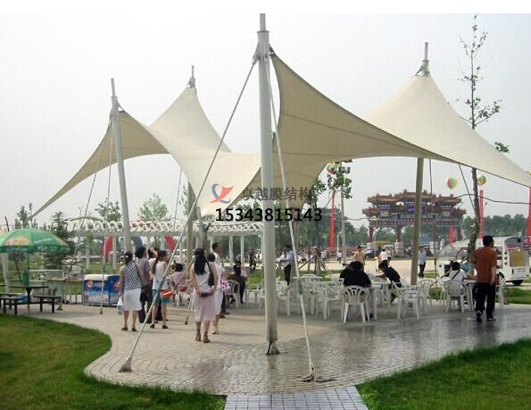三、張拉景觀膜結(jié)構(gòu)遮陽棚在設(shè)計(jì)的過程中要注意受力點(diǎn)的受力是否均衡,這樣才能保證膜布不被撕裂,也能保證車棚的美觀性。