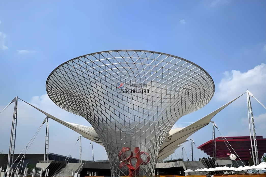 上海世博會軸線廣場膜結(jié)構(gòu):大面積的ETFE膜結(jié)構(gòu)不僅提供了遮陽避雨的功能,還通過其半透明的特質(zhì),營造出夢幻般的光影效果。