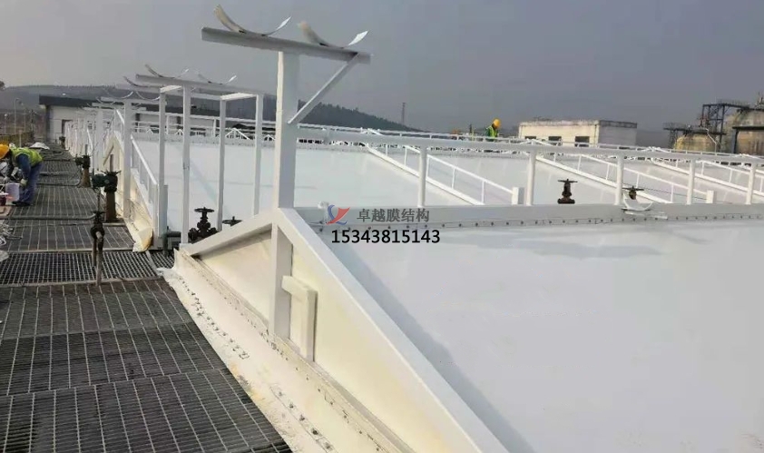 污水池反吊膜采用的膜材抗腐蝕性能高,抗撕扯抗氧化能力好,不僅可以克服外界的不良環(huán)境(如風(fēng)載,雪載)等,而且自身采用優(yōu)質(zhì)PVDF涂層,經(jīng)過uv光固化處理,具有防霉抗菌作用。廢氣收集效率高;污水池加蓋反吊膜結(jié)構(gòu)之所以受歡迎,是因為其廢氣收集率高,做到對環(huán)境的零污染。
