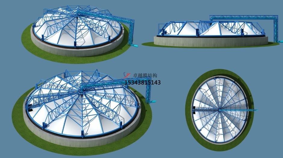 污水處理池加蓋,也稱反吊膜封閉,與常規(guī)建筑膜結(jié)構(gòu)不同之處在于,鋼構(gòu)在外部做支撐結(jié)構(gòu),膜材安裝在內(nèi)部做防護(hù)密閉,此類膜材采用污水池專用材料,具有防腐蝕、抗老化、免維護(hù)、美觀耐久、經(jīng)濟(jì)適用等優(yōu)點。