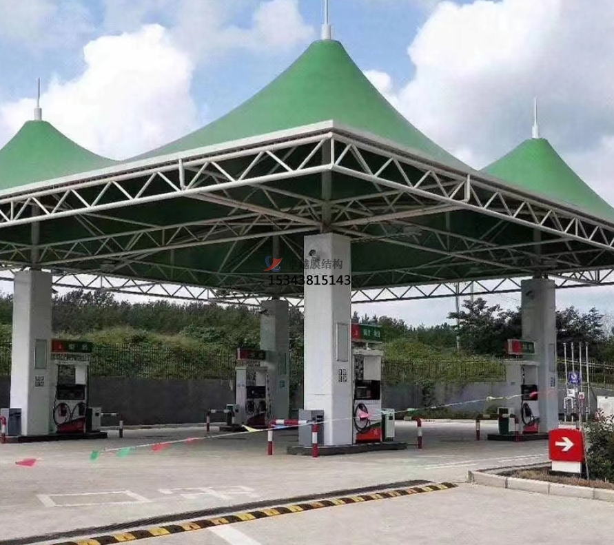 3. 靈活的造型設計:加油站膜結構頂棚可根據建筑需求進行個性化設計,采用曲面造型,不僅美觀大方,還能有效分散雨水和風力,增強頂棚的穩(wěn)定性。