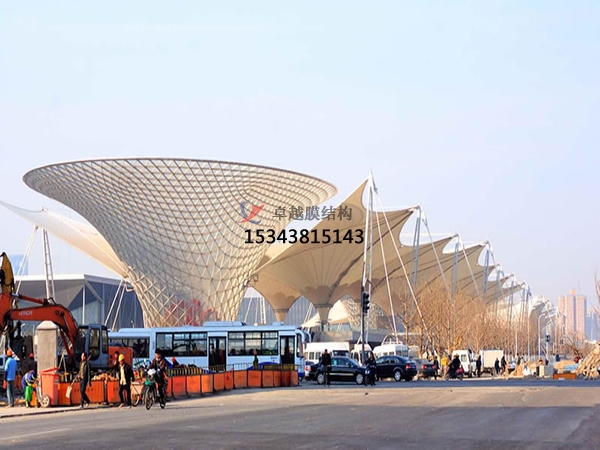 7、對(duì)邊角及有褶皺的區(qū)域進(jìn)行局部張拉調(diào)節(jié),并更終固定膜面及節(jié)點(diǎn);完成雨水系統(tǒng)安裝及防水覆蓋等;