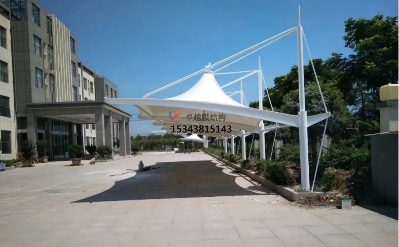七、在膜結構充電樁工程現(xiàn)場,膜材應安放在搭設的輔助架子上,在室外堆放時應采取保護措施。安裝前應在主體結構上架設臨時的網(wǎng)格拉索,以支承展開的膜材。