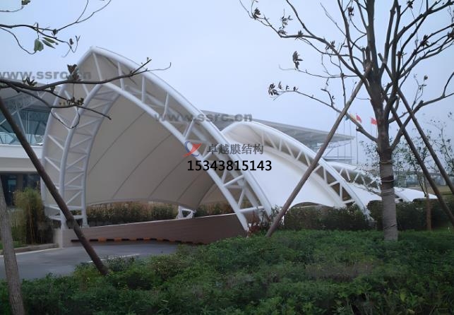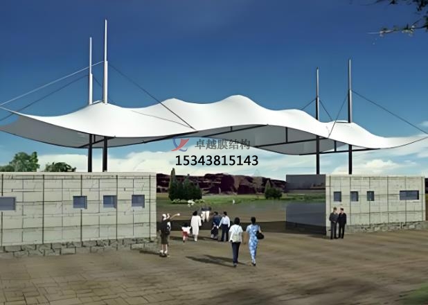 膜結(jié)構(gòu)出入口是一種以高強(qiáng)度膜材料與支撐結(jié)構(gòu)(鋼索、鋼架等)結(jié)合的建筑形式,具有輕盈、美觀、耐用等特點(diǎn),廣泛應(yīng)用于各種場所的建筑形式,主要用于提供遮陽、遮雨的功能,同時具有較高的觀賞性和藝術(shù)感。