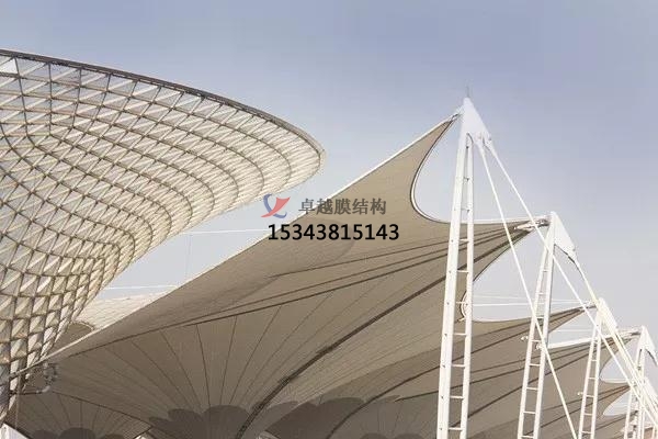 膜結(jié)構(gòu)遮陽(yáng)棚由立柱和頂棚構(gòu)成。立柱多由金屬合金制作,如鋼,鋁等,質(zhì)量輕且質(zhì)地硬,頂棚則是由膜結(jié)構(gòu)材料制成。