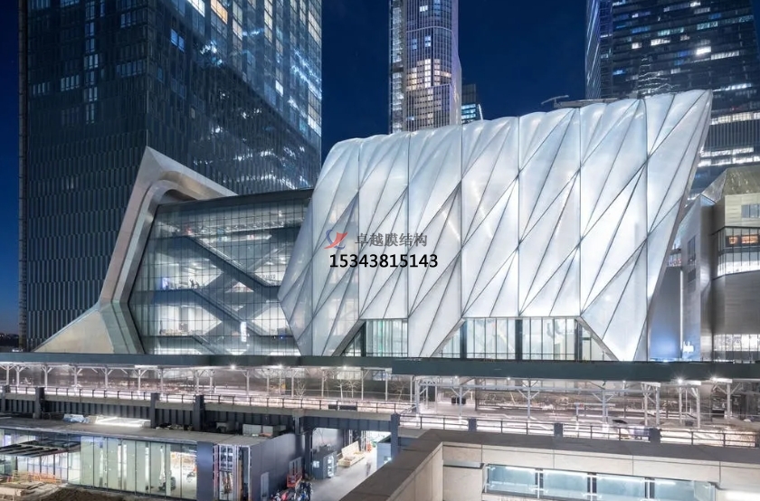 The Shed藝術(shù)中心樓高37米,有一個(gè)可伸縮的建筑表皮,伸縮式外殼由暴露的鋼斜架構(gòu)成,并包裹在半透明墊層中。其墊層由耐用輕質(zhì)且隔熱性能極佳的四氟乙烯(ETFE)聚合物構(gòu)成。