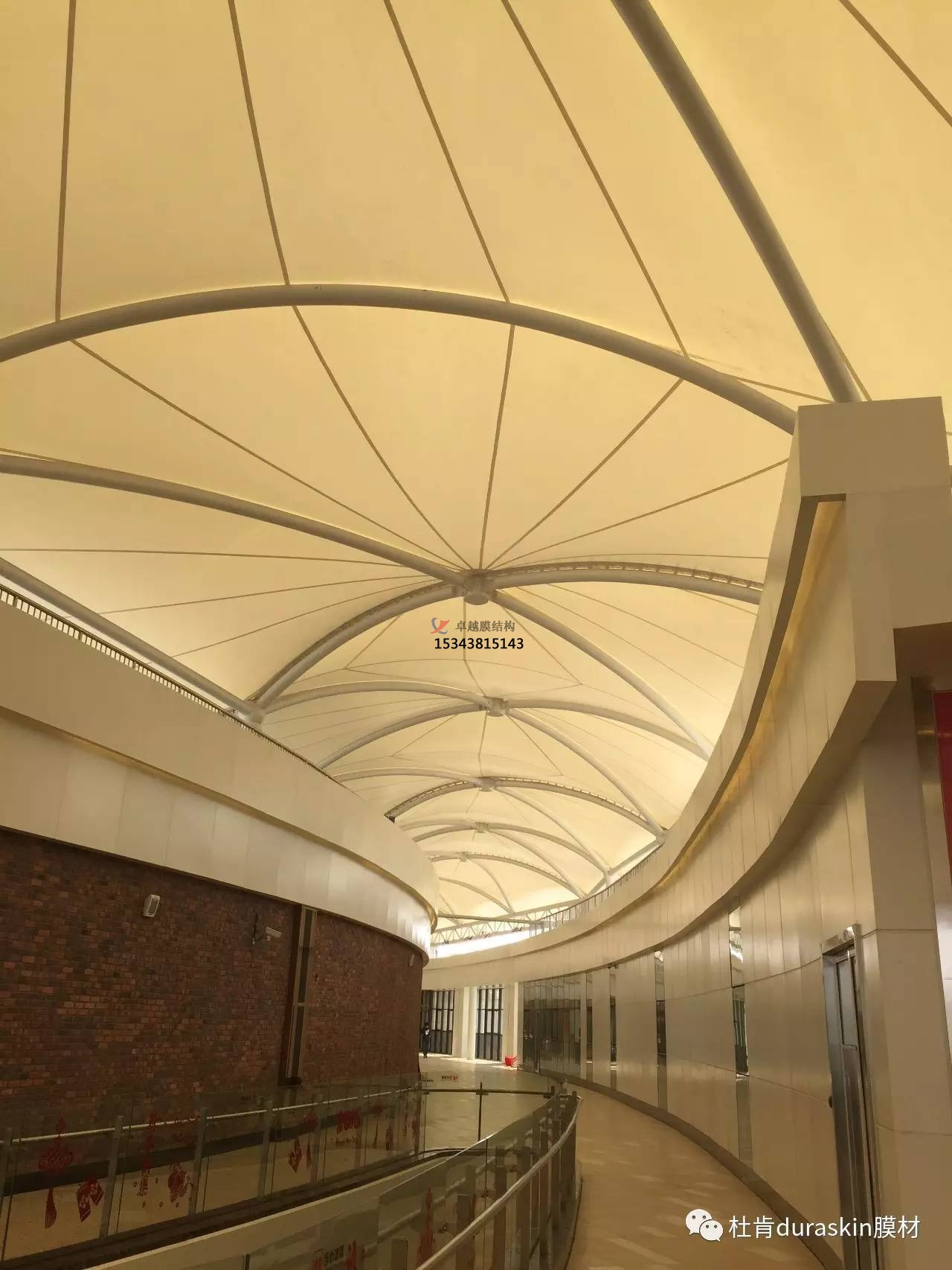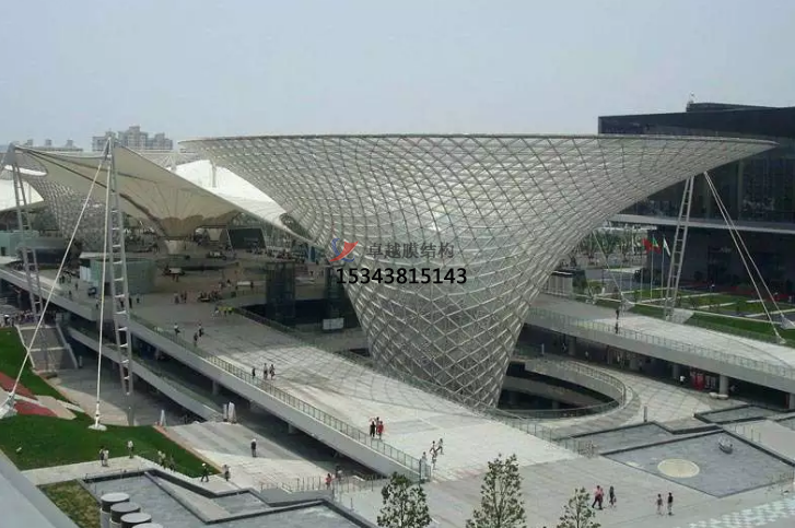 建筑入口使城市公共空間與建筑空間相鄰的界面,成為城市空間的組成部分。它是人們視覺更先接觸的部分,因此,除了功能以外,還應(yīng)有很強的標(biāo)識性,并能體現(xiàn)建筑的個性,是建筑環(huán)境和城市景觀的重要組成部分。由于膜結(jié)構(gòu)自然的曲線美是其他結(jié)構(gòu)類型無法比擬的,故成為近來建筑入口及屋頂經(jīng)常采用的形式。