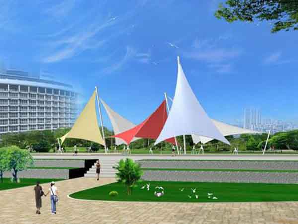 2、景觀膜結(jié)構(gòu)是目前發(fā)展很快的一種新型空間結(jié)構(gòu),是一種效率極高的張力集成體系,可以充分發(fā)揮鋼索的強(qiáng)度與張拉整體結(jié)構(gòu)的空間作用。它通過(guò)鋼骨架、鋼索與膜材共同受力形式穩(wěn)定曲面來(lái)覆蓋建筑空間,具有高度的形體可塑性和結(jié)構(gòu)靈活性,即通過(guò)對(duì)膜材內(nèi)部施加一定的預(yù)張力,使其具備了抵抗外荷載能力,從而充當(dāng)結(jié)構(gòu)材料的一種結(jié)構(gòu)體系。我公司先后在池州地區(qū)承接了池州百荷公園景觀、皋城中心廣場(chǎng)景觀、池州萬(wàn)達(dá)廣場(chǎng)景觀小品的設(shè)計(jì)施工,簡(jiǎn)介如下: