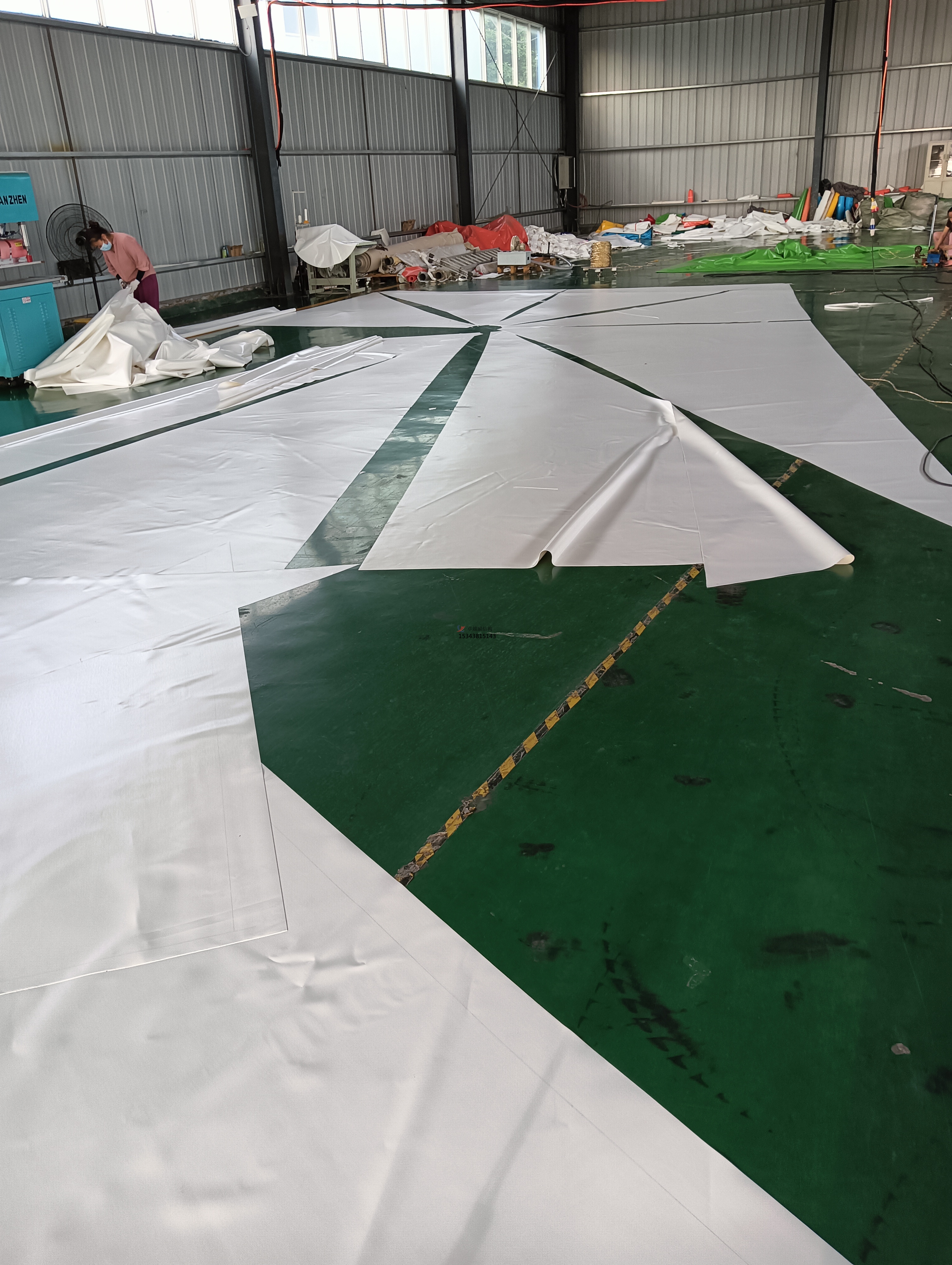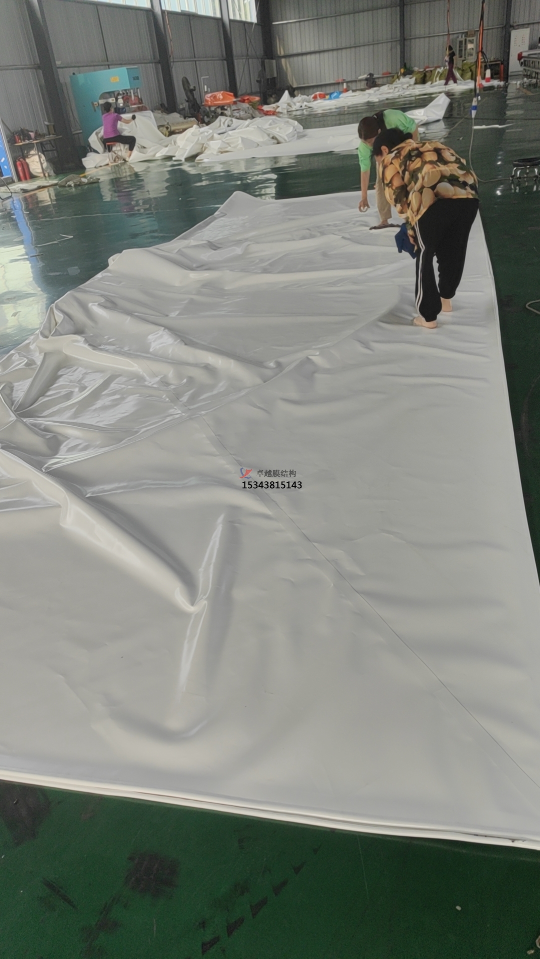 通常,膜面的加工制作包含以下工序:(1)準備工作, 包括技術(shù)準備、場地及設(shè)備準備、膜材料進場檢測等;(2)放樣、排版與下料;(3)熱合試驗;(4)熱合加工;(5)邊角處理;(6)清洗、包裝。