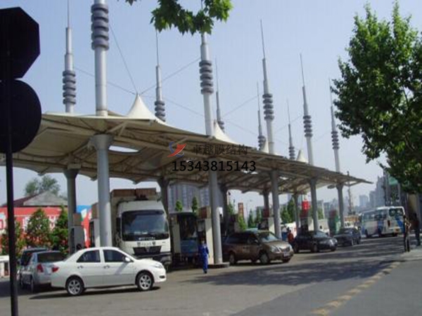 張拉式膜結(jié)構(gòu),以膜材,鋼索及支柱構(gòu)成,運(yùn)用鋼索與支柱在膜材中導(dǎo)入張力以達(dá)安靖的方法,除了可實(shí)踐具有構(gòu)思,立異且美麗的造型外也是能展現(xiàn)膜結(jié)構(gòu)精力的結(jié)構(gòu)方法,近年雨棚來(lái),大型跨距空間也多選用以鋼索與緊縮材料構(gòu)成鋼索網(wǎng)來(lái)支撐上部膜材的方法,加氣站雨棚施工精度要求高,結(jié)構(gòu)功用強(qiáng),且具豐盛的表現(xiàn)力。