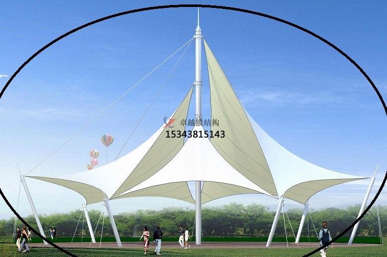 景觀園林膜結(jié)構(gòu)特點(diǎn):其具有造型美觀獨(dú)特、透光性好、環(huán)保節(jié)能、自重輕、施工便捷、耐用性強(qiáng)、功能多樣等特點(diǎn)。膜結(jié)構(gòu)可以通過張拉形成各種獨(dú)特的曲面造型,如波浪形、傘狀、樹形等,能夠與自然環(huán)境完美融合,打造出極具藝術(shù)感和視覺沖擊力的景觀效果,為園林增添別樣的魅力。膜材具有優(yōu)良的透光性,透光率一般在 20%-95%之間,白天可以讓自然光均勻地漫射進(jìn)來,使園林空間更加明亮、舒適,同時節(jié)約大量照明能源,夜間在燈光的映射下又能營造出絢麗多彩的光影效果。膜結(jié)構(gòu)采用的膜材可回收利用,符合綠色建筑理念,而且其良好的保溫性能和反射光熱作用,能有效降低建筑的能耗,減少對空調(diào)等設(shè)備的依賴。膜材料自重僅為鋼結(jié)構(gòu)的 1/8,混凝土的 1/40,因此對地基基礎(chǔ)的要求較低,可建成大跨度的建筑,并且在地震等自然災(zāi)害發(fā)生時,具有良好的抗震性能。膜結(jié)構(gòu)的預(yù)制化程度高,現(xiàn)場安裝速度快,能夠大幅縮短工期,減少施工對場地和周邊環(huán)境的影響。常用的膜材如 PTFE、ETFE 等具有良好的耐候性、抗紫外線能力和防火性能,能夠適應(yīng)各種惡劣天氣條件,使用壽命長達(dá) 15-30 年。不僅可以作為遮陽避雨的設(shè)施,還能作為景觀雕塑、燈光載體、休息亭、觀景平臺等,提升園林空間的使用價值和功能性。