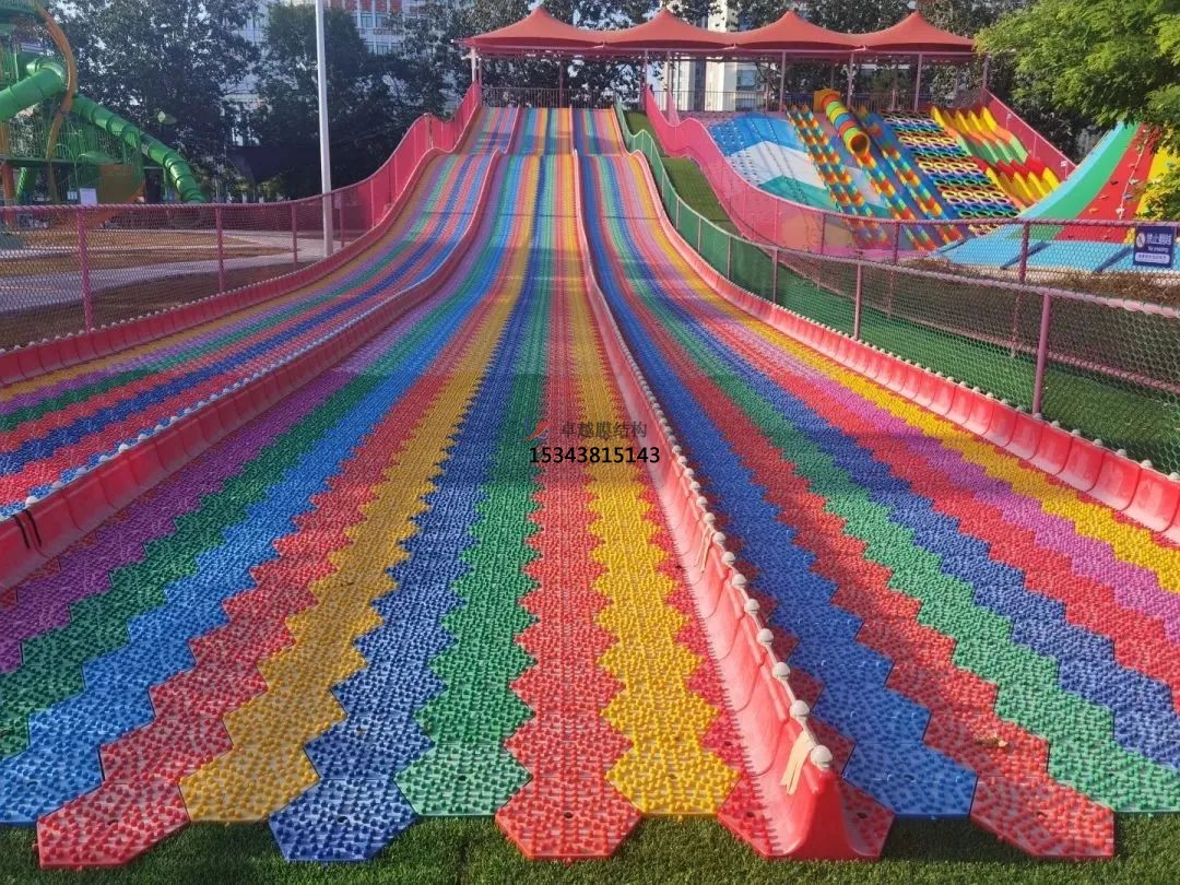 遮陽棚架采用鋼結(jié)構(gòu)或混凝土結(jié)構(gòu),具有強度高、耐用性強等特點。遮陽布采用高強度、防水、防曬的聚酯纖維材料,能夠有效阻擋紫外線和雨水的侵蝕,保護兒童的安全?;啦捎貌噬芰瞎?,設(shè)計為彩虹顏色,可供兒童滑行玩耍,增加樂園的樂趣。